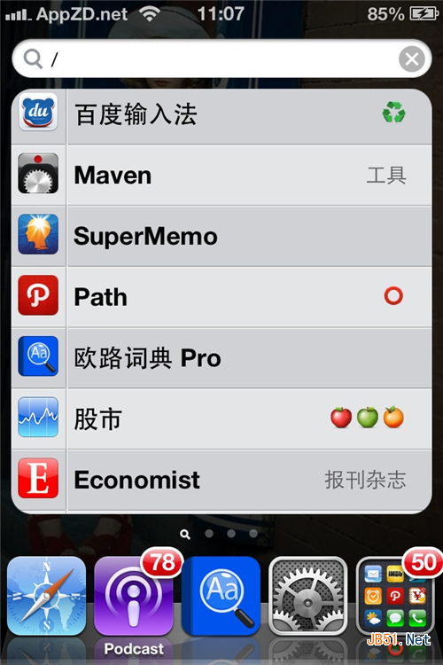 打开后你可以搜索iPhone/iPad里所有与关键词有关的东西,包括联系人、信息、邮件、歌曲等内容,甚至是你男友已经删除掉的不想被你看到的信息内容哦,有同学要问了,那标题里查看所有的应用程序用什么关键字捏,不着急,看下图: