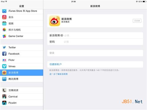 进入【设置】-【新浪微博】选择“添加账户”后输入账号和密码即可。