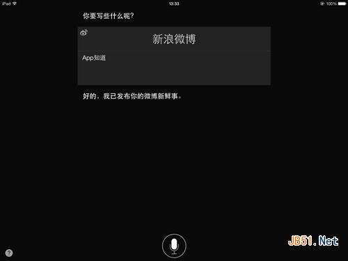 页面出现后,我们可以直接说出微博内容,Siri在自动识别后会询问你是否发布,回应“发布”即可;
