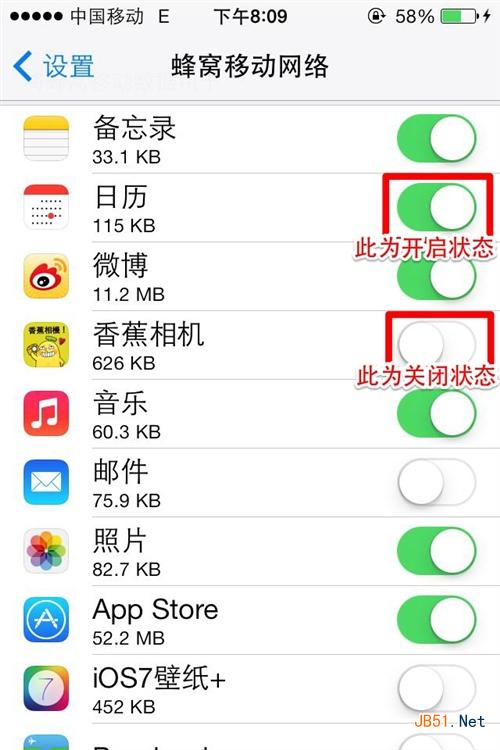 3、选择你需要禁止其联网的app,将右边的开关改为关闭状态即可(如下图所示)。