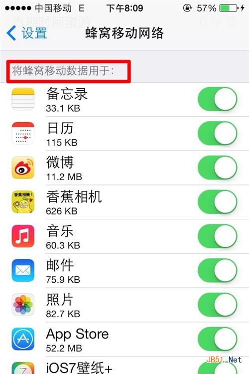 2、将屏幕向下滑动至“将蜂窝数据用于”,这时我们可以看到所需联网的应用列表以及其具体的流量消耗数据;