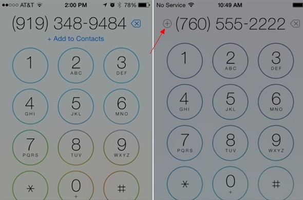 另外,iOS 7.1 beta4拨号键盘界面下,添加至联系人功能的图标转移至号码左侧,如下图所示: