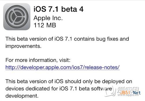 本月初,苹果放出了 iOS 7.1 beta 3,今天早上接着又放出了最新的 beta 4 供注册开发者安装测试,最新的版本号为 11D5134c,其中内置了 Xcode 5.2 开发者预览版 4。除此之外,Apple TV 也收到了 beta 版固件更新。到目前为止,最新的正式版 iOS 7 系统是 iOS 7.0.4,是在 11 月份正式推出的,由于目前 iOS 7 系统中还有一些问题没有得到彻底解决,所以最新的 iOS 7.1 或许还要经历一轮测试才会开放给普通用户。