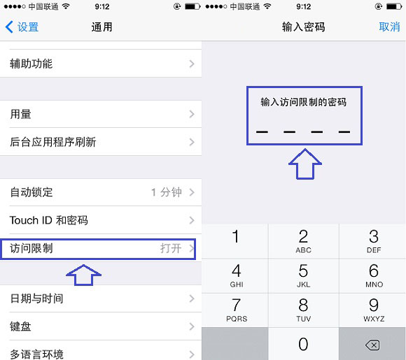 进入通用设置后,我们再选择进入“访问限制”设置,进入后,需要输入手机密码进入,我们输入您之前设置的手机密码,进入即可,如下图所示: