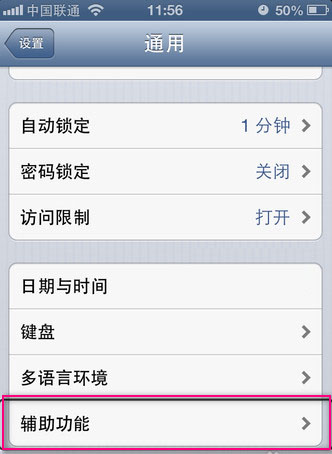 用三个手指向上滑动,找到下面的“辅助功能”,轻按一次选中,再按二次进入辅助功能选项,如下图所示