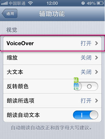 然后,轻按一次来选中“VoiceOver”,再按二次进入开关切换选项,如下图所示