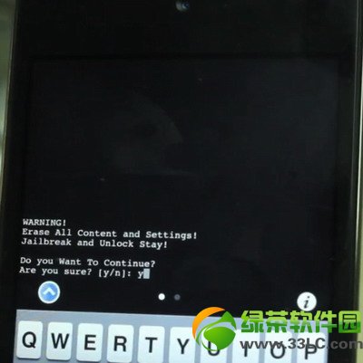6、 接着键入“y” (不包括双引号),表示确认,再按设备虚拟键盘上的“return”。 之后,你的设备就开始恢复了,可能会需要几分钟的时间,耐心等待即可。