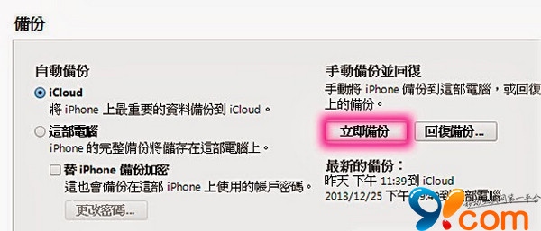 备份 (Backup):将 iPhone 里的资料备份到电脑 iTunes 上。