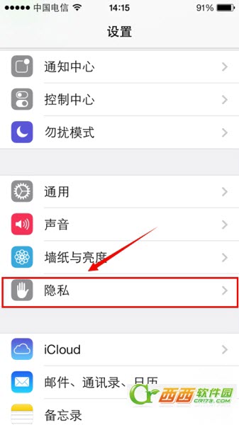 2)在“设置”中找到“隐私”这一选项,然后点击进入“隐私”。(如下图所示)