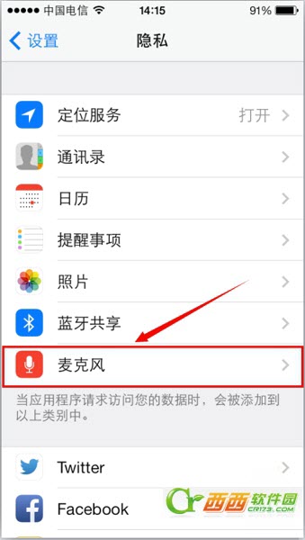 3)进入“隐私”之后,我们可以看到“麦克风”的选项,点击点入“麦克风”。(如下图所示)
