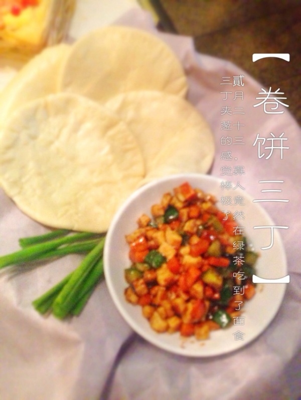 这道菜是套菜,饼、菜在一起才构成了这道菜。故而采用俯拍,将整道菜纳入镜头中。这种拍摄方法同样可以用于拍茶点、糕点等。