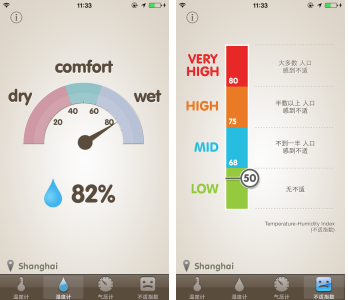 苹果的天气 App 在我看来已经覆盖了天气预报应该提供给用户的所有信息。但如果换一个视角来看天气情况,会不会更适合大家日常的生活呢?Thermo 以人体感受为出发点,是一款更适合每天查看和使用的天气类App。相比于原生天气软件,Thermo 并不支持提供多地的天气查询,这对于很多商旅人士而言可能不是很方便。Thermo 使用定位功能,只为用户提供所在地的天气信息,包括温度,适度,气压以及不适指数四项内容。重要的是,用户可以了解到空气湿度以及总体天气环境给人体的感受如何,而不是仅仅看到苍白的湿度或温度指数。尽管功能全面性上远不如原生 App,但是每天打开几次 Thermo,看看当时的天气情况以及不适指数,还是很有趣很实用的。