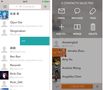 相比于原生 App,Cobook 增加了更多的通讯录信息,支持 Instagram 以及 LinkedIn 的用户信息导入,尤其是 LinkedIn 的联系人列表,对很多人而言非常重要。Cobook 最大的优势在于它提供的手势操作。滑动的方式和大家熟悉的 Mailbox 一样,支持左右滑动以及左右长时间滑动,以此可以完成通话,短信以及 Facetime 等多项功能。用户可以直接在联系人列表进行操作,不需要再一个个点进去。不仅如此,在 Cobook 右滑后可以进行多人操作,包括群发邮件、短信,加标签( Cobook 的加标签相当于分组)等功能。这是很多用户非常看重的。此外,Cobook 还提供多种的联系人排序方式,非常方便。