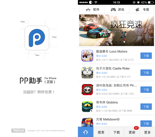 iOS7.1带来大量的改进优化的同时也使我们与越狱暂别,不能越狱的iOS7.1设备仍然可以使用PP助手正版下载海量正版应用,更加稳定更加高速,无需登录无需注册Apple ID,直接一键快速下载安装。