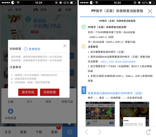 PP助手正版具有独特的协助/请求修复功能。在同一个Wi-Fi网络环境下,支持一台iOS设备协助另一台iOS设备修复闪退,功能中还附有详细的图文教程,操作简单迅速上手。