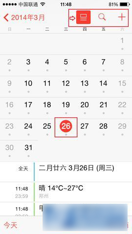 解决方法:如果出现上述情况,别着急,首先进入【日历】,双击今天的日期,是双击哦!然后在右上角会出现三个图标,分别是【列表】、【放大镜】、【+号】,点击【列表】就可以了。(如下图所示)