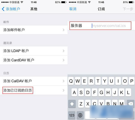 第二步:打开你的iPhone,进入【设置】->【邮件】->【通讯录】->【日历】->【添加账户】->【其它】->【添加已订阅的日历】,此时需要你输入一个服务器地址。(如下图所示)