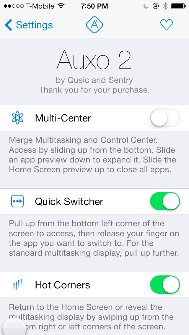 Auxo是最初在iOS6时代发布的后台增强插件,美观性与易用性并存,是当时最火的后台插件。现正式推出第二版,由原班设计人马打造,对Auxo 2做了深度设计改造,完美适配iOS7。手势操作分别对应屏幕底部的三个位置,左,中,右。本文将从Auxo 2注意事项、兼容性、安装教程、使用教程(3个基本功能+6个高级功能)、问题反馈、视频演示,六个方面详细解析Auxo 2。