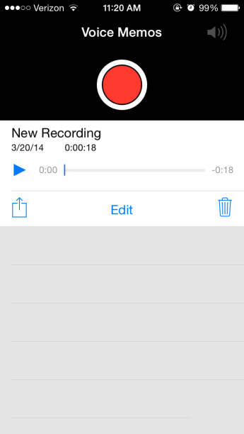 苹果计划在iOS 8中移动语音备忘录中控制按钮的位置,让用户更方便寻找。一些iOS 7用户抱怨语音备忘录中的控制按钮令人迷惑,而iOS 8将修复这些问题。
