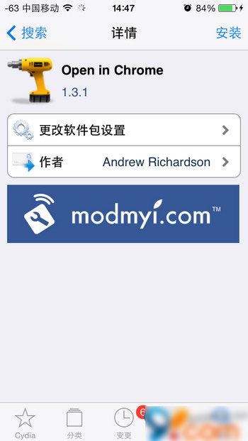 提示:如果搜索不到Open in Chrome,可以进入Cydia—【变更】—点击左上角【刷新】—再搜索该插件。
