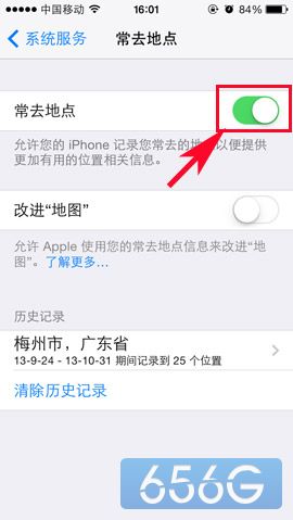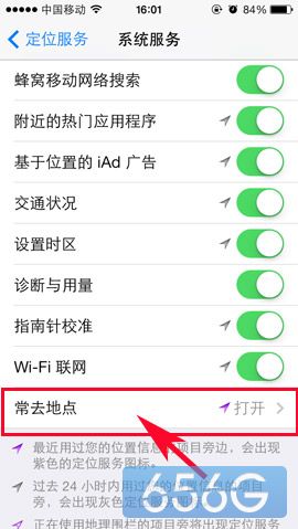 3)在【系统服务】界面就能看到【常去地点】功能了,点击进入后对【常去地点】栏的功能按钮进行关闭即可。(如下图所示)