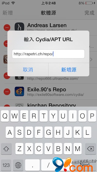 1. 首先你的设备必须是已越狱的 (查看越狱教程),先开启 Cydia,点击下方【管理】—【软件源】—右上角【编辑】—左上角【添加】—添加新源地址http://rpetri.ch/repo/—【添加源】