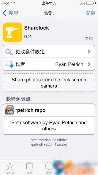 提示注意:由于是测试beta版,有一定机率需要用户自行重新安装插件才能使用。在此,建议用户可以在Cydia安装ShareLock后重启两次相机,若无效,就重新再安装一遍。