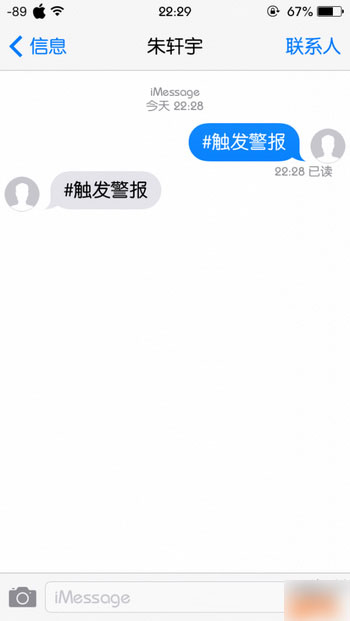 “发信人”可以空着不写,“信息内容”可以自定义,例如填写“#触发防盗”