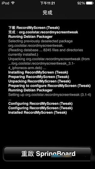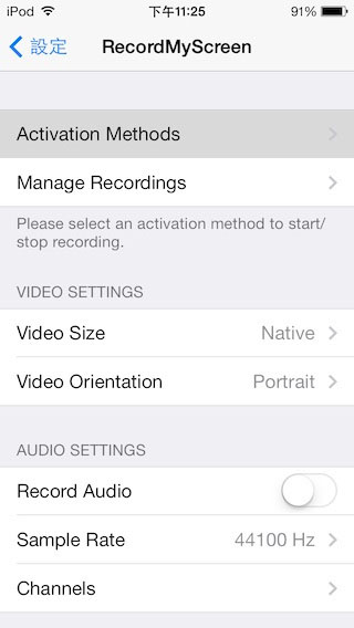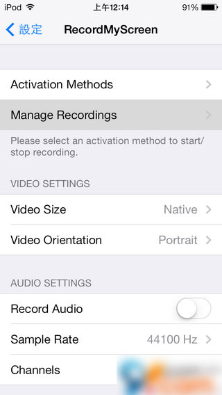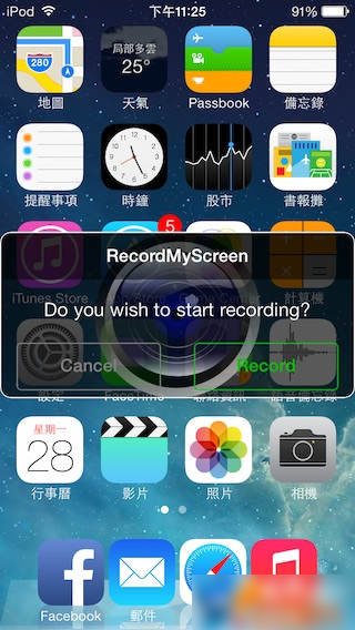 RecordMyScreen iOS7平台首款屏幕录像工具,基于Activator激活,触发Activator动作后会弹窗提示您是否选择录像,点击录像后屏幕无任何工作提示,后台运行,再次触发Activator动作为结束录像。