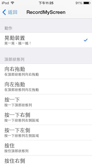 完成后再进行启动动作(本教程设置的是摇一摇),就会关闭RecordMy Screen