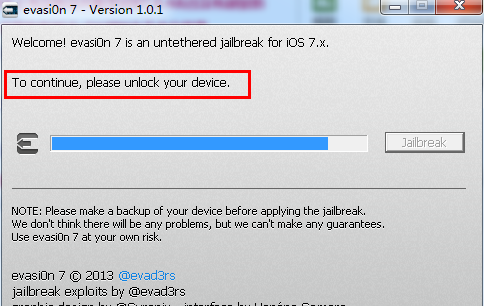 【Evasi0n7】v1.0.1已经解决设置锁屏密码导致白苹果。如果【Evasi0n7】工具停留此步骤不动(如图)提示:”要继续,请解锁iOS设备“。