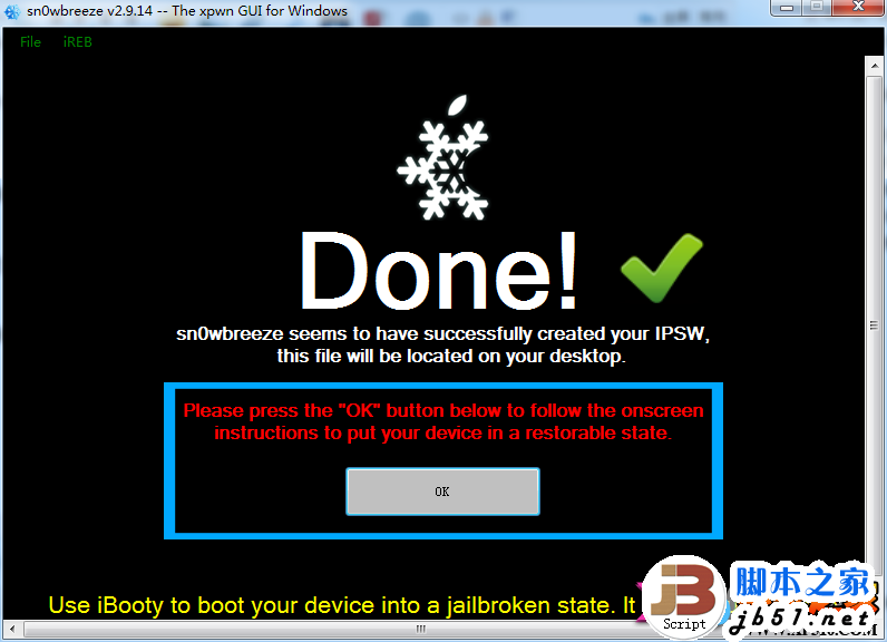 五、制作降级固件成功后将iOS 设备连接电脑并点击【sn0wbreeze 雪花】降级工具点击【OK】