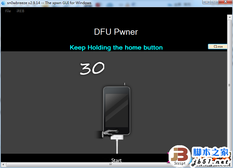 先将iOS设备关机后点击【sn0wbreeze 雪花】降级工具的【Start】按钮,然后按照提示步骤操作: