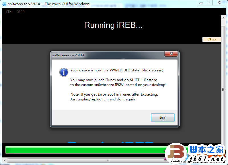 七、【sn0wbreeze 雪花】降级工具成功引导进入DFU模式--点击确认。