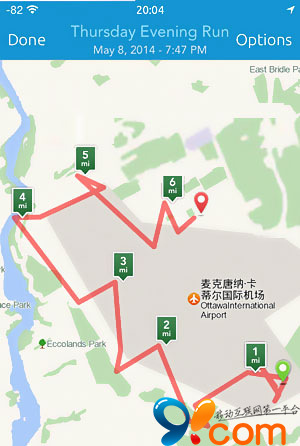 进入全局位置自定义菜单,找个适合跑步的地方。加拿大的麦克唐纳.卡蒂尔国际机场不错!围着这个机场,每在一个位置长按一次,即确定一个坐标。标记的时候会显示编号,标好后,点击标记也会显示编号。我依次标上18个坐标,保存以后,我们先进手机自带“地图”看一下。注意查看各图上的时间和位置情况。位置是随着时间变换变换的。