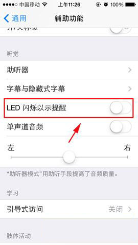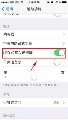 2)在辅助功能里,找到“LED 闪烁以示提醒”,然后打开右边的开关,设置完后苹果iphone5c来电闪光灯就设置成功了。(如下图所示)