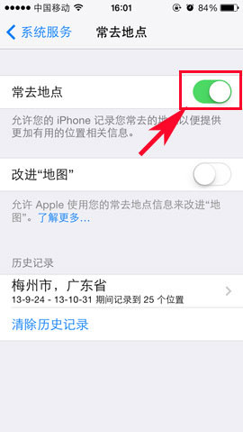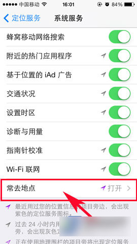 3)在“系统服务”界面就能看到“常去地点”功能了,点击进入后对“常去地点”栏的功能按钮进行关闭即可。(如下图所示)