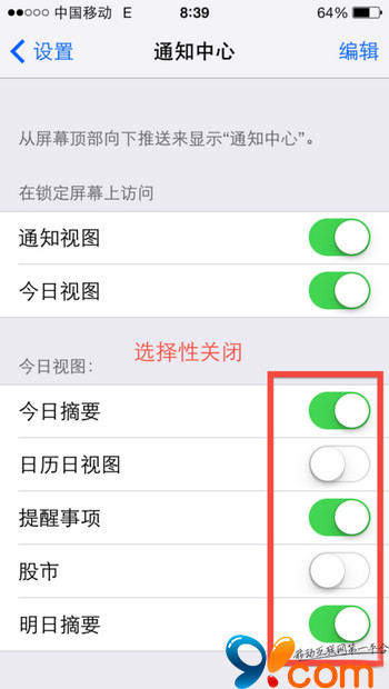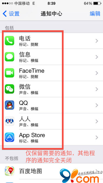 在“设置”-“通知中心”下按您需要保留必要程序在通知中心的显示(电话短息微信等这类软件肯定是需要保留的)