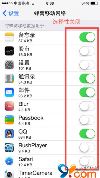在“设置”-“蜂窝移动网络”下关闭一部分实际并不需要蜂窝网网络应用程序的开关