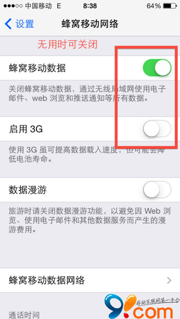 在“设置”-“蜂窝移动网络”下在您不需要时可关闭“蜂窝移动数据”