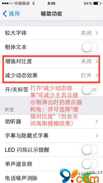 若您不介意关闭 iOS 7 的特效:(高斯模糊化)磨砂玻璃效果,还可打开“增强对比度”