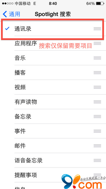 在“设置”-“通用”-“Spotlight搜索”下选择性关闭不需要在主页进行搜索的项目