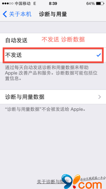 在“设置”-“通用”-“关于本机-“诊断与用量”下选择“不发送”错误报告