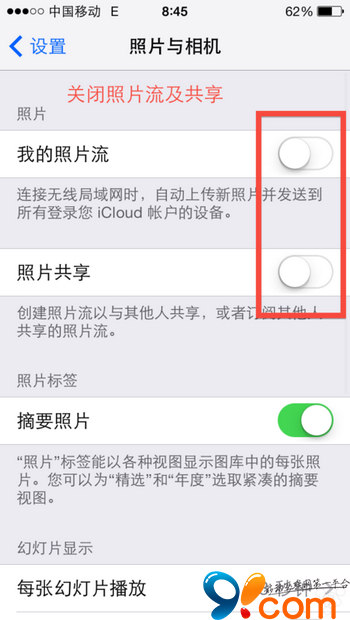 若您不需要将照片与您其他苹果设备通过“照片流”分享时请关闭“我的照片流”和“照片共享”功能
