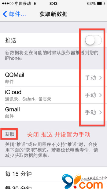 在“设置”-“邮件、通讯录、日历”-“获取新数据”下按您需要选择性关闭“推送”