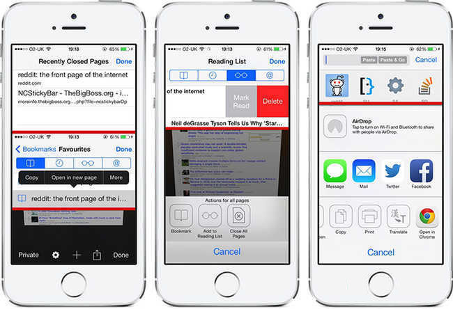 - 书签页长按已保存连接可快速新建页面跳转,复制链接,邮件、短信、twitter、facebook、微博共享连接