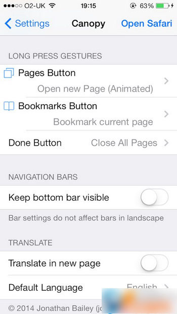 安装完成后,依次进入【设置】→【Canopy for iOS 7】进行相关设定。可以设置长按手势、书签,导航等操作。
