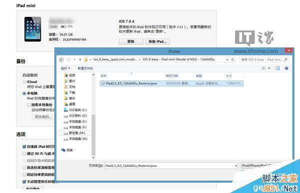 找到自己的设备型号(机身背部),前往《苹果iOS8测试版系统固件官方下载地址大全》下载对应的固件,请解压以获得 .ipsw 文件为准。