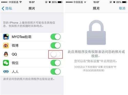 第三步:进入之后我们会看到手机中会访问“照片”功能的应用,我们只需要点击右侧的开关按钮就可以自行设置访问照片的应用了,比如我们不想“QQ”来访问照片,我们只需要关闭QQ的选项即可。