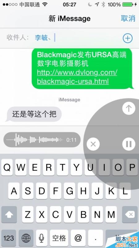 短信息和iMessage方面,已经能发语音了,因为是晚上也不知道对方能不能收到。只是只发一条的话有个BUG就是会被地下的输入框挡住已发送的语音条。